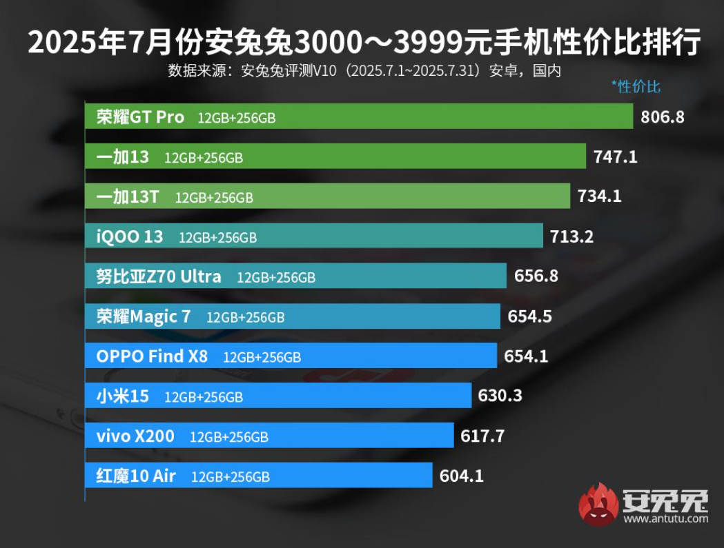 至于该机的16GB+512GB版本,更是来到了3584元左右,相比发布时又亲民了一些。考虑到这款手机上市还不到半年的时间,在中端机的价格的情况下,却有诸多可以和高端机相抗衡的配置和体验,对消费者而言也是福音了。这款荣耀GT Pro是一款公认超高性价比的机型,在上市之后连续多个月荣获安兔兔3000~4000价位性价比冠军的宝座,打败了一加13、iQOO13以及小米15等机型。